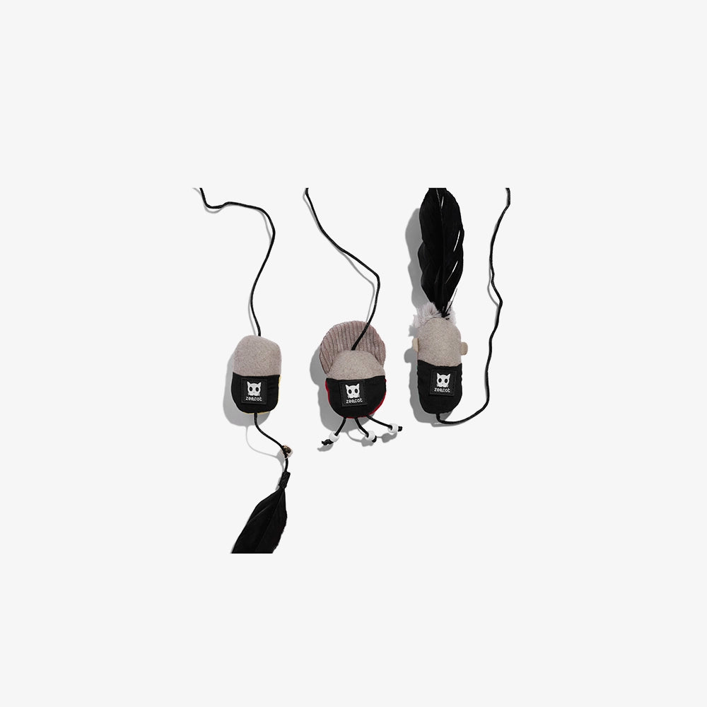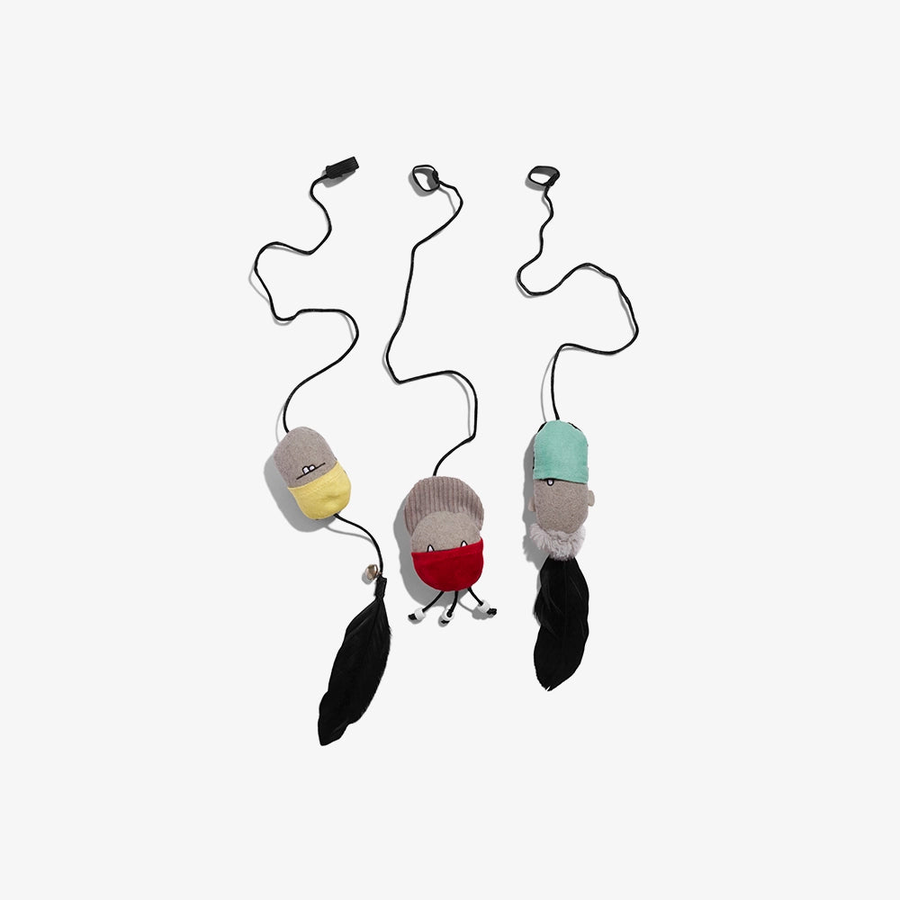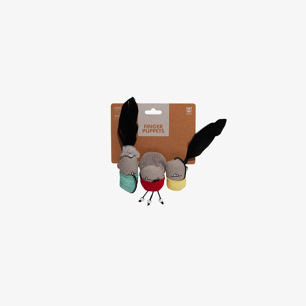 Las Marionetas Finger Puppets de Zee.Cat son un set de 3 juguetes interactivos con cuerda para gatos. Pueden usarse como juguete tipo teaser (interactivo con tu gato) o como juguete independiente escondiendo la cuerda en su bolsillo especial.